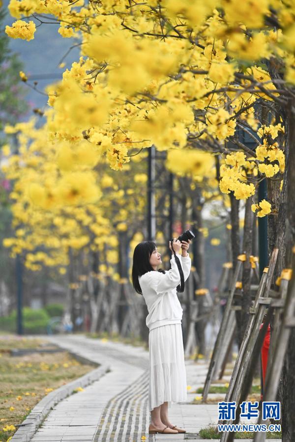 2月16日,广西南宁市民在平乐大道拍摄绽放的黄花风铃木。