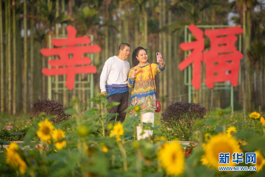2月16日,游客在海南省琼海市嘉积镇龙寿洋万亩田野公园中赏花拍照。
