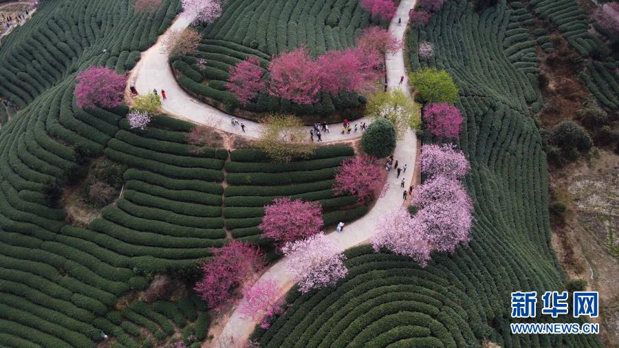 2月16日,游客在福建省龙岩市永福镇台品樱花茶园景区观赏樱花。