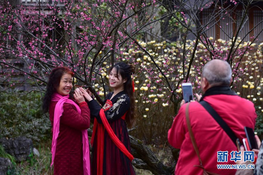 2月16日,游客在贵州省黔南布依族苗族自治州都匀市秦汉影视城景区赏花游玩。
