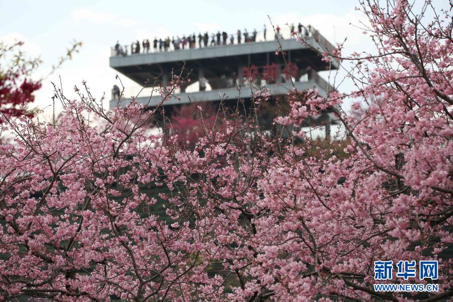2月16日,游客在福建省龙岩市永福镇台品樱花茶园景区观赏樱花。