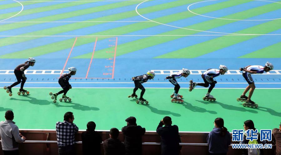 2月16日,在江苏省苏州市运河体育公园,孩子们进行轮滑运动。