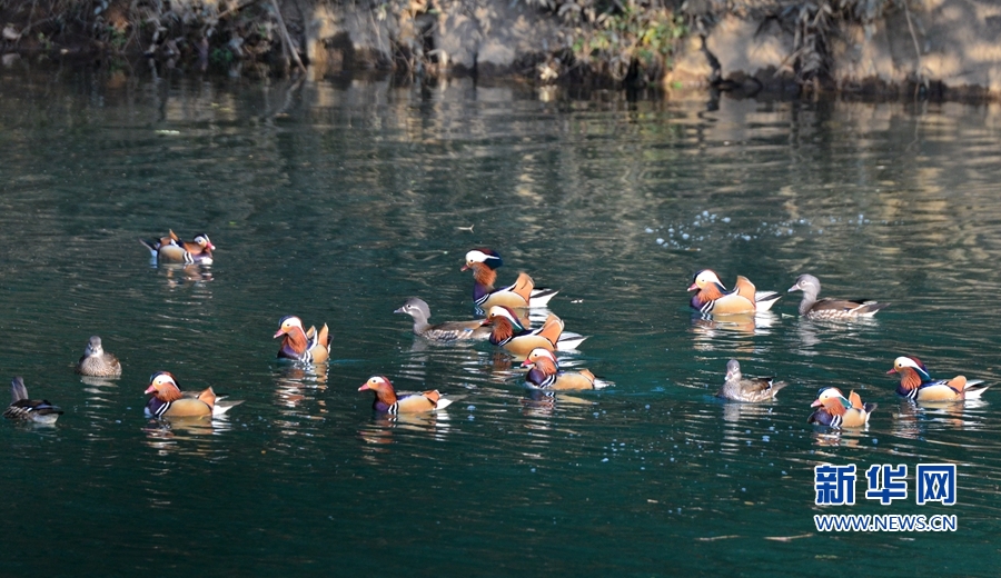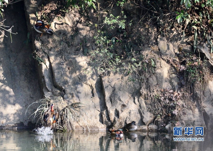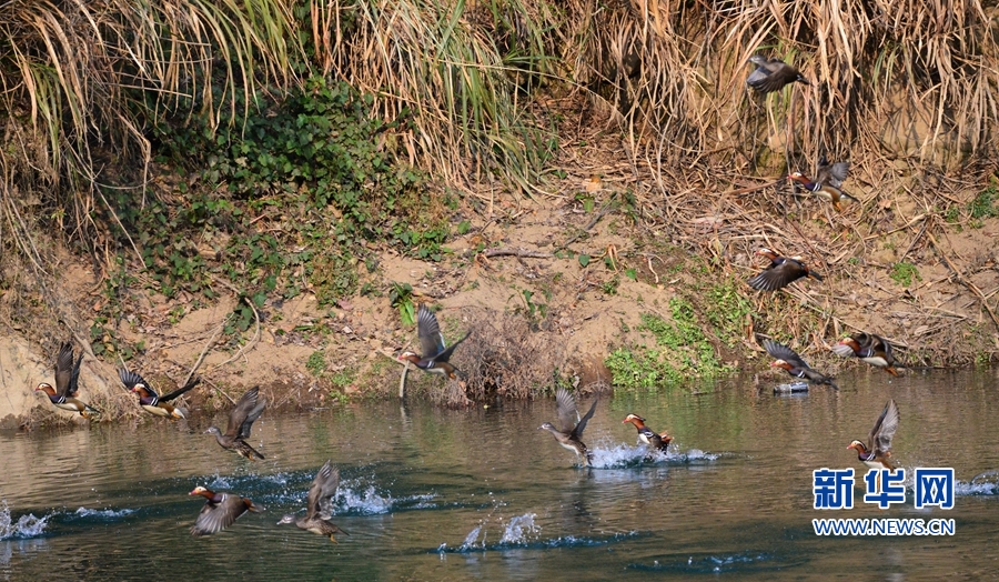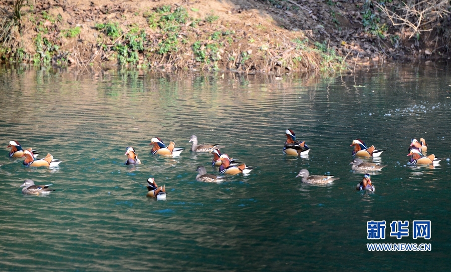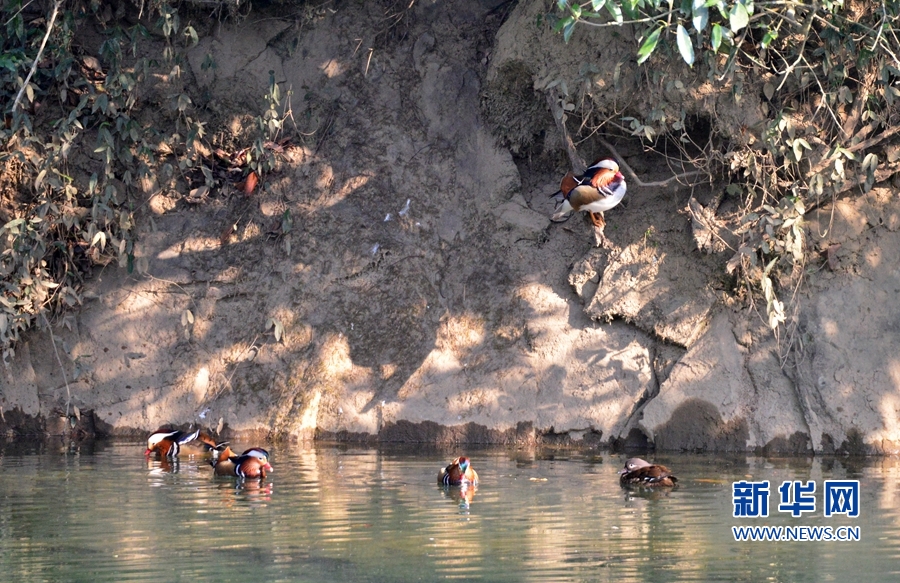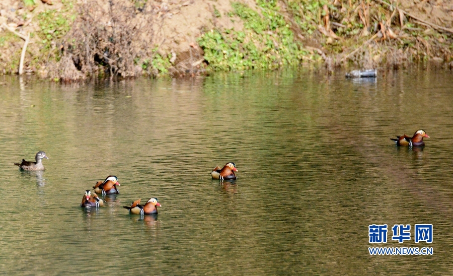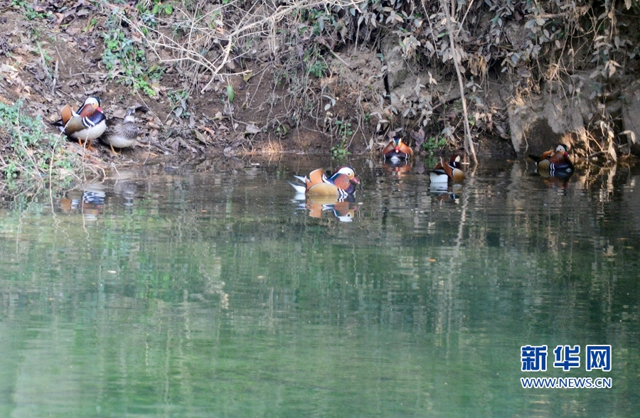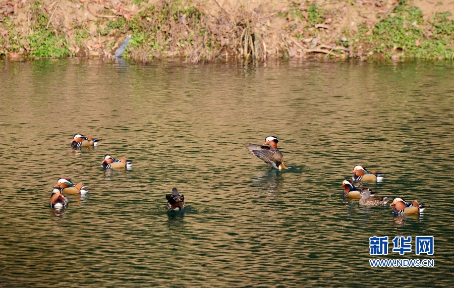 鸳鸯在长垅村附近河段游弋。新华网发(徐庭盛 摄)