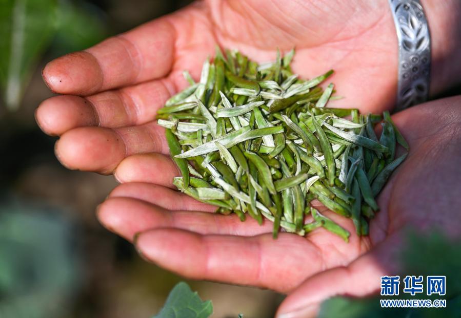 2月17日,贵州省独山县影山镇翁奇村的村民在展示新采摘的春茶。