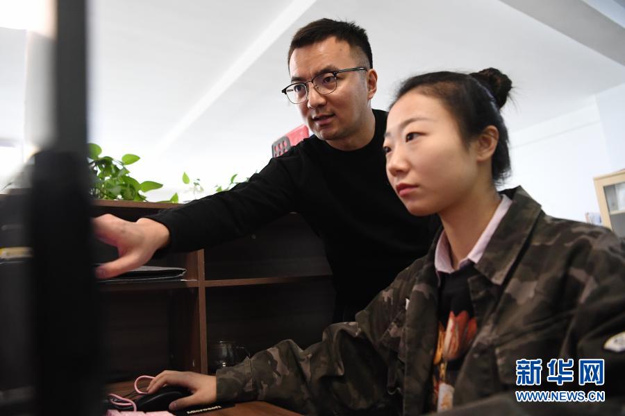 马成虎(左)和同事一起设计敦煌元素文创产品(1月14日摄)。35岁的马成虎是甘肃丝绸之路文创工场的总经理。新华社记者 陈斌 摄