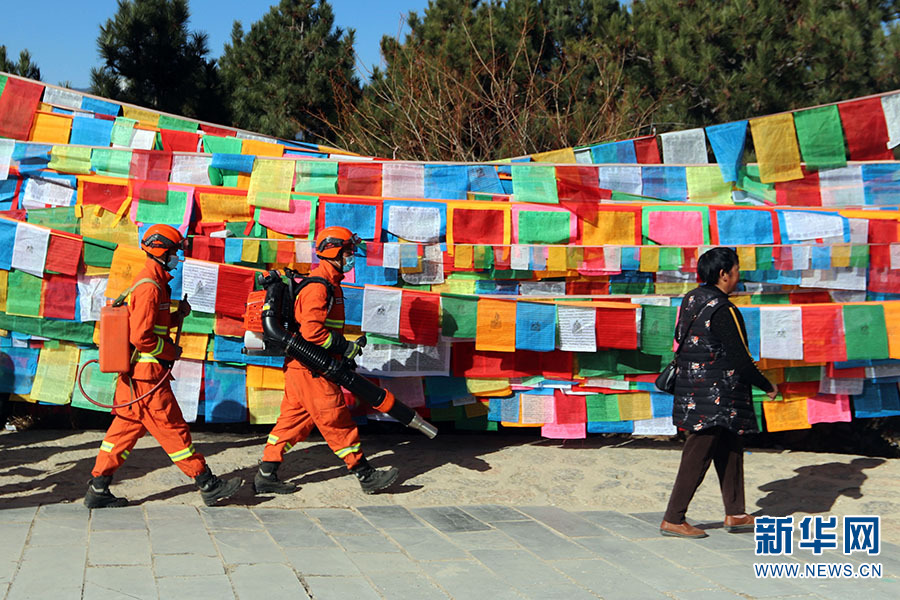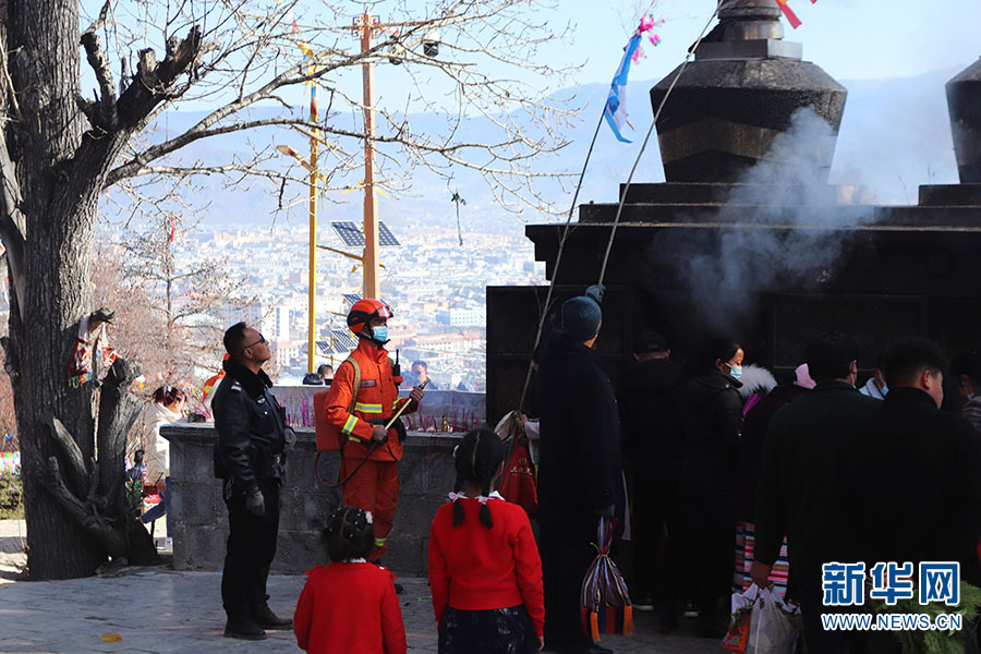 在白鸡寺,除了防火宣传的消防员,还有携带风力灭火机、灭火水枪等灭火装备的消防员来回巡护。据迪庆州森林消防大队消防员田超介绍,森林消防员在此执勤,一方面是督促香客们在规定地点烧香,另一方面是向香客宣传森林防火知识,而全时携带灭火装备,可做到一旦发生火情立即处置。