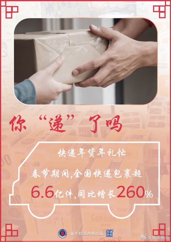 新华社北京2月18日电(记者赵文君)国家邮政局快递大数据平台监测显示,春节期间(2月11日至17日),全国邮政快递业累计揽收和投递快递包裹6.6亿件,同比增长260%。