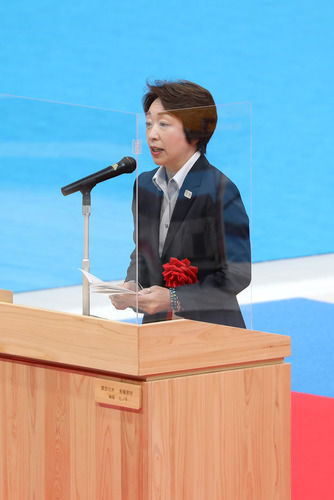 图为2020年10月24日,日本奥运大臣桥本圣子在东京水上运动中心启用仪式上致辞(资料照片)。新华社记者 杜潇逸 摄