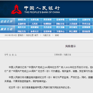 中国人民银行18日发布提示称,已将“中国共产党成立100周年纪念币”纳入2021年纪念币发行计划,但尚未发行。目前市场上所谓“中国人民银行发行”的“中国共产党成立100周年”纪念币(钞)均为臆造,相关宣传、销售、预定等均为违法违规行为。