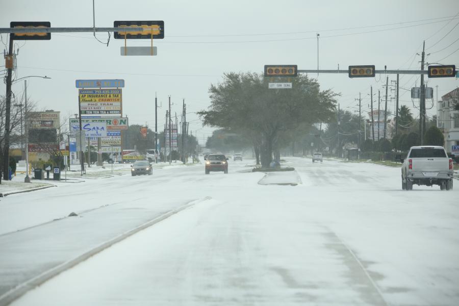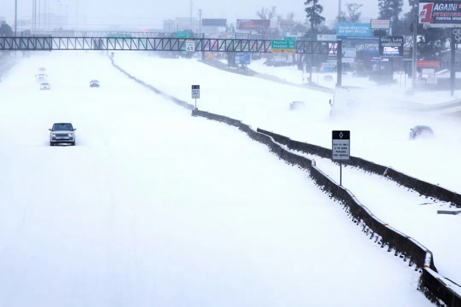 2月15日,在美国得克萨斯州休斯敦,车辆在积雪的道路上行驶。新华社发(劳承跃摄)