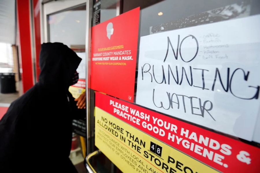 2月17日,在美国得克萨斯州阿灵顿,一家便利店贴出“没有自来水”的告示。新华社/美联