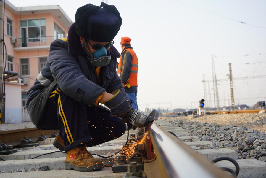 中国铁路济南局集团公司济南工务段济西线路车间职工正在对线路进行打磨。(中国铁路济南局集团公司济南工务段供图)