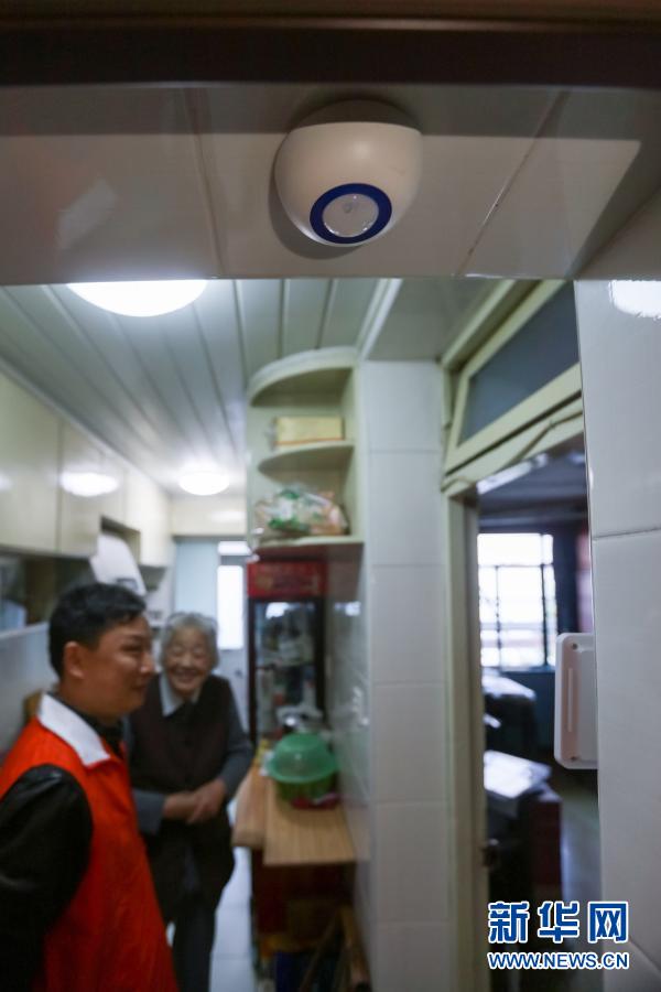 上海黄浦区半淞园路街道瞿溪新村89岁独居老人郑文娟家门上方安装了智能感应器,该智能感应器通过监测老人出门情况保护独居老人安全(2020年11月13日摄)。新华社记者 王翔 摄