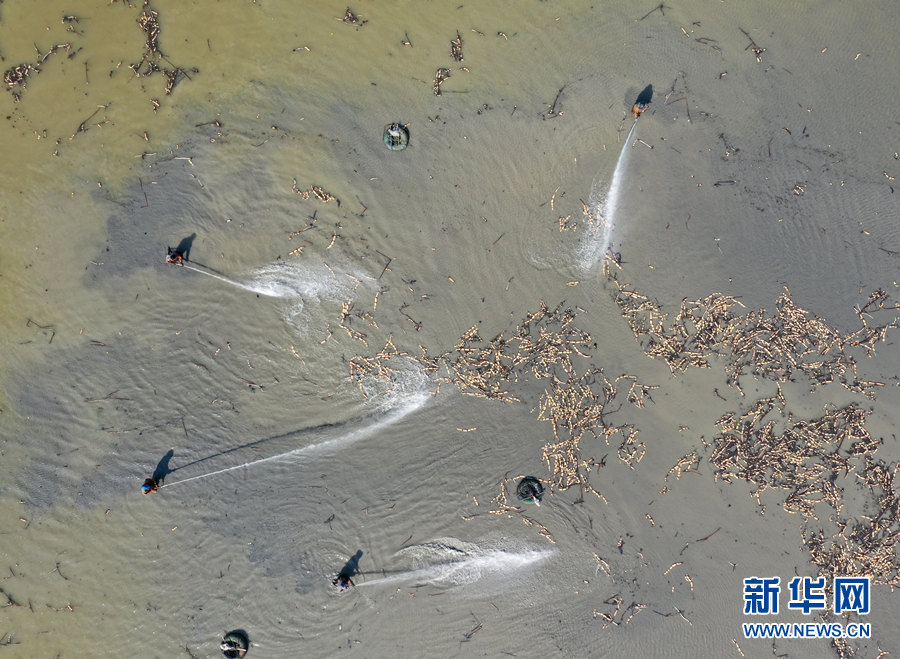 2月19日,安徽省全椒县十字镇农民在藕田里采收莲藕。新华网发(沈果 摄)