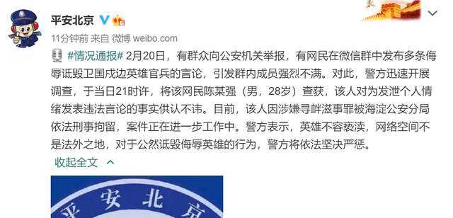 2月20日,有群众向公安机关举报,有网民在微信群中发布多条侮辱诋毁卫国戍边英雄官兵的言论,引发群内成员强烈不满。对此,警方迅速开展调查,于当日21时许,将该网民陈某强(男,28岁)查获,该人对为发泄个人情绪发表违法言论的事实供认不讳。目前,该人因涉嫌寻衅滋事罪被海淀公安分局依法刑事拘留,案件正在进一步工作中。