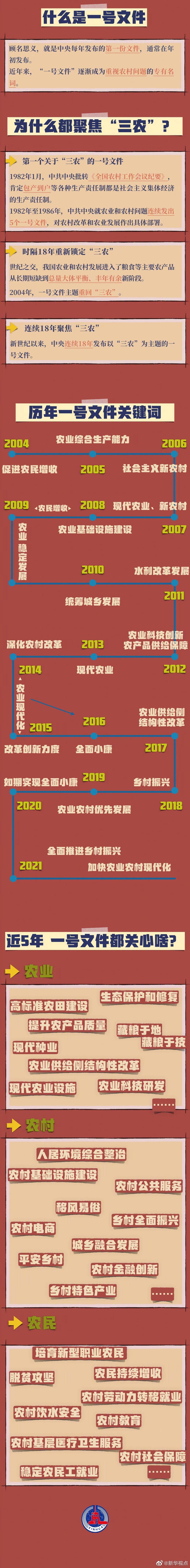 21日,新华社受权发布《中共中央 国务院关于全面推进乡村振兴加快农业农村现代化的意见》。新世纪以来,中央一号文件连续18年聚焦三农,究竟深意何在?都是知识点,戳图了解下↓