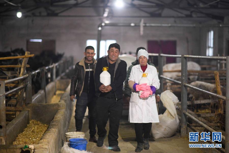 在加依纳古特村养殖合作社,吾拉木·图尼亚孜(中)将刚挤好的驴奶交给前来收购的企业工作人员(2月4日摄)。新华社记者 赵戈 摄