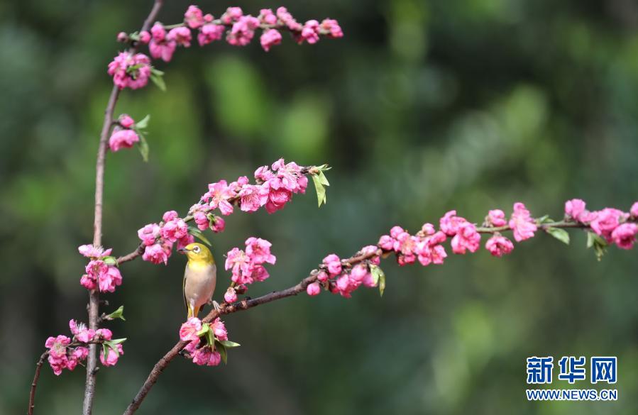 2月22日,在湖南省衡阳市雁峰区五星村的山林里,一只绣眼鸟站在花枝中。连日来,随着气温回升,湖南衡阳春花盛开,春意盎然。新华社发(曹正平 摄)