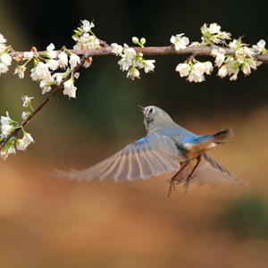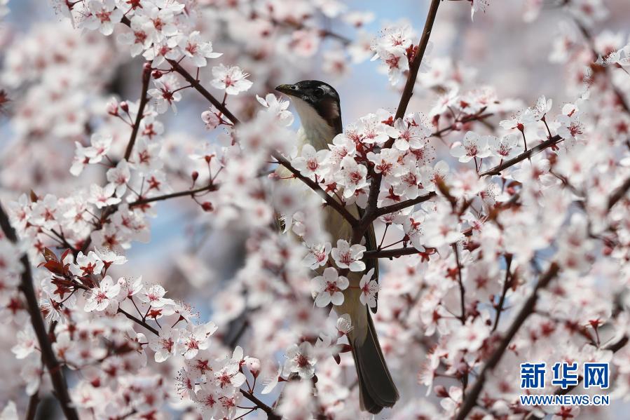 2月22日,在湖南省衡阳市高新区太阳广场,一只小鸟在花枝间停歇。连日来,随着气温回升,湖南衡阳春花盛开,春意盎然。新华社发(罗盟 摄)