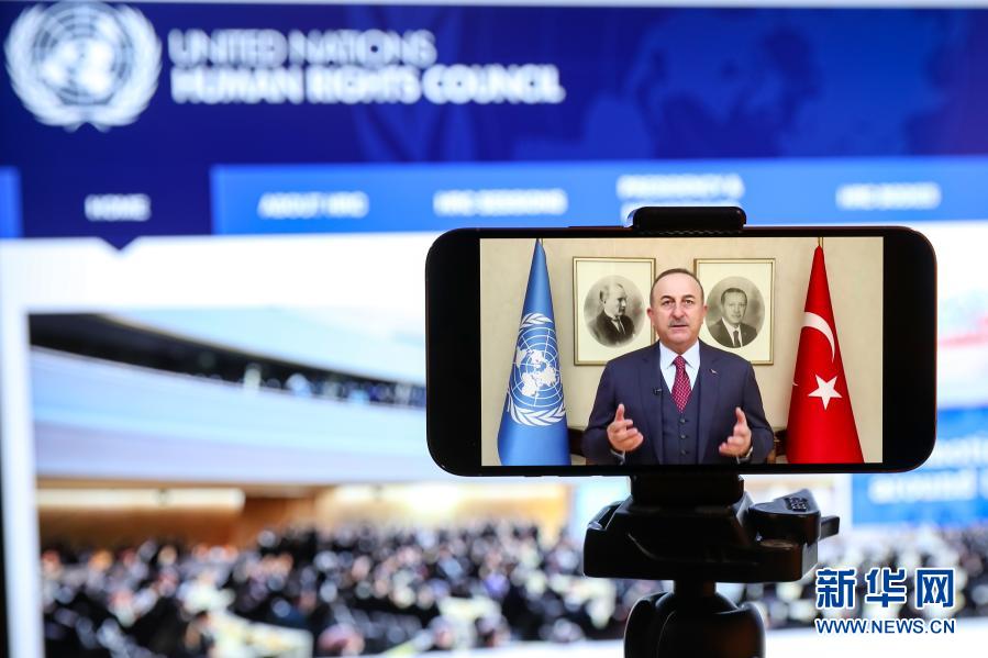 这是2月22日在比利时布鲁塞尔拍摄的土耳其外交部长恰武什奥卢在联合国人权理事会第46届会议高级别会议上致辞的屏幕画面(背景为联合国人权理事会官方网站画面)。