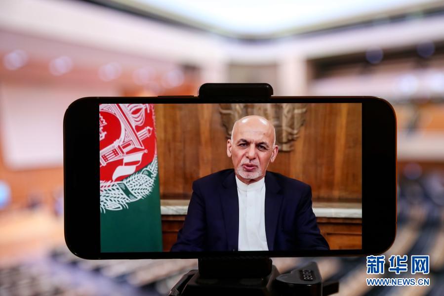 这是2月22日在比利时布鲁塞尔拍摄的阿富汗总统加尼在联合国人权理事会第46届会议高级别会议上致辞的屏幕画面(背景为联合国人权理事会会场截图)。