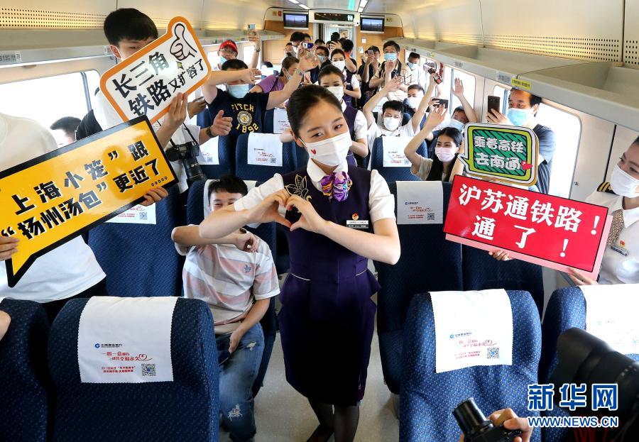 C3836次列车乘务员在车厢内为旅客表演节目(2020年7月1日摄)。2020年7月1日,沪苏通铁路开通运营。