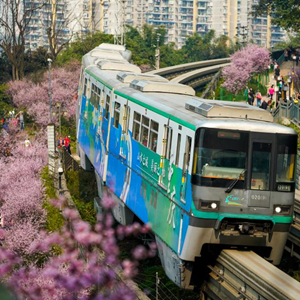 初春时节,重庆气温逐渐回暖,暖阳里的山城春意盎然。在重庆轨道交通2号线佛图关段,山城步道上的梅花簇簇绽放,单轨列车穿越花海,组成一幅赏心悦目的独特城市景观。