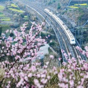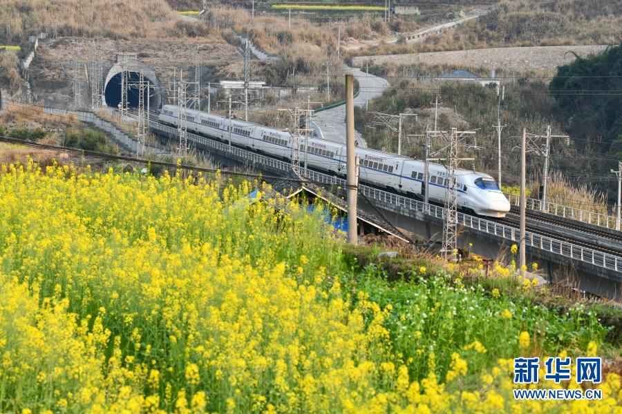 早春时节,贵州省黔东南苗族侗族自治州境内的油菜花、桃花、樱花次第盛开,动车组列车穿行其间,一路繁花,美不胜收。