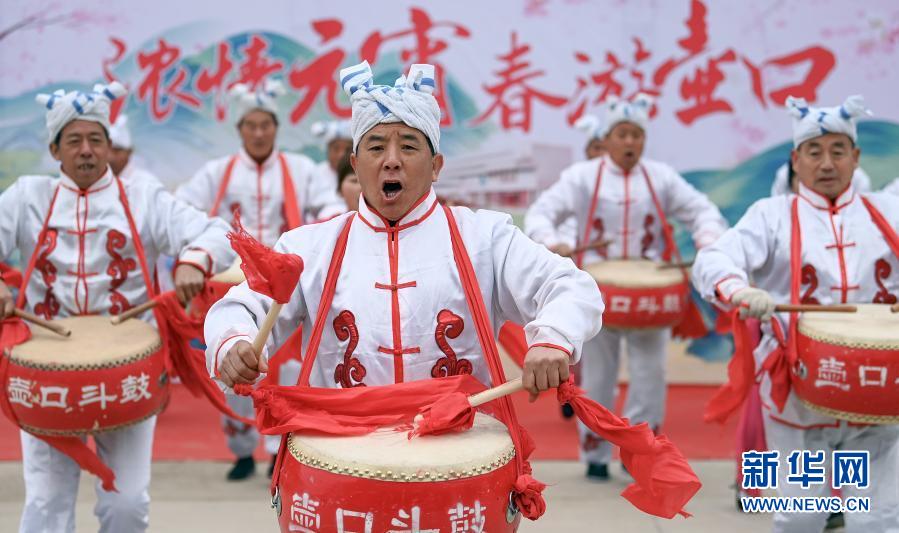 2月24日,民间艺人在陕西壶口瀑布景区为游客表演壶口斗鼓。