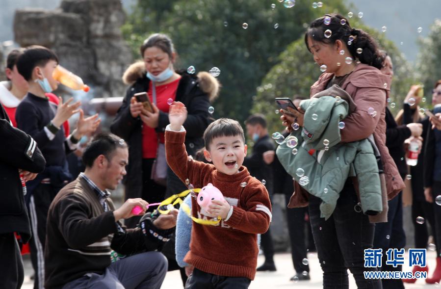 2月14日,在贵州省毕节市黔西县新仁苗族乡化屋村东风湖畔,一名小朋友在玩泡泡。新华社发(史开心 摄)