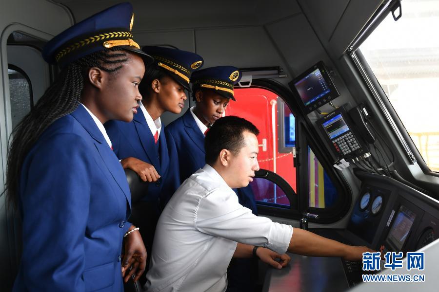 2017年5月17日,在肯尼亚内罗毕,肯尼亚火车司机跟随中国老师张程熟悉操作流程。连接肯尼亚蒙巴萨港和首都内罗毕的蒙内铁路是中非合作、“一带一路”建设的重点项目,累计为当地直接创造逾4.6万个工作岗位。新华社记者 孙瑞博 摄