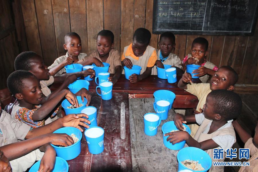 2019年10月17日,在贝宁经济首都科托努郊区的托优优美小学,学生们在午餐时享用中国援助的米饭。从2018年开始参与中国、贝宁和世界粮食计划署联合实施的贝宁中小学生“全国学校食堂计划”后,该校的学生们每天都能吃上一顿中国援助的大米饭。新华社发(塞拉芬摄)