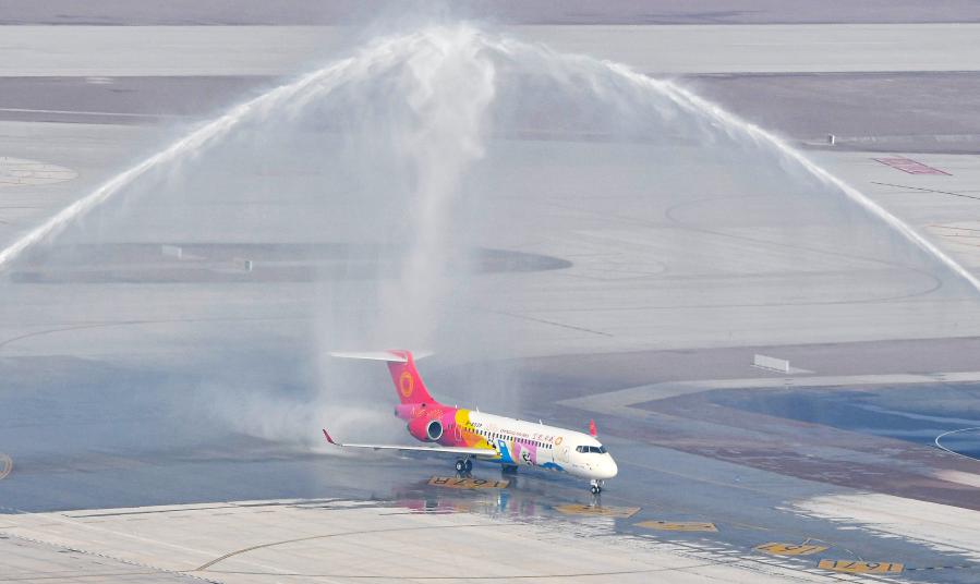 1月22日,参加试飞仪式的成都航空的ARJ21客机降落在天府国际机场,通过“水门”。自当日起,成都天府国际机场开始真机试飞,这标志着该机场向着投运通航迈出了关键一步。新华社发(张勇 摄)