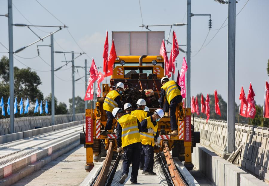2月1日,施工人员在赣深高铁汕湛高速特大桥无砟轨道上铺设首条铁轨。赣深铁路设计时速350公里,建成通车后赣州和深圳两地的通行时间将由目前最快6个小时左右压缩至2个小时以内。 新华社记者刘大伟 摄