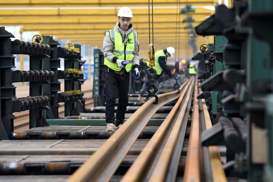 1月30日,在中铁十七局安九高铁安庆铺轨基地,工作人员进行卸轨作业。安九高铁是国家中长期铁路网规划“八纵八横”高速铁路主要通道京港(台)通道的重要组成部分,设计时速350公里。新华社记者刘军喜 摄