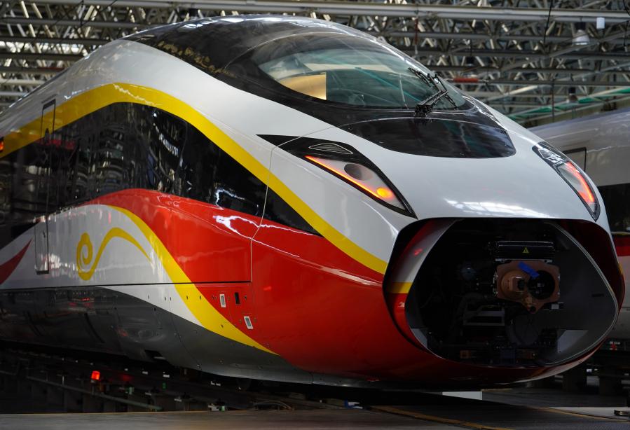 这是2020年12月4日拍摄的时速400公里跨国互联互通高速动车组。列车采用世界首创的时速400公里高速可变轨距转向架和内置轴箱转向架,可实现在不同国家、不同铁路轨距线路上的自动变轨,能够在零下25摄氏度至零上50摄氏度的低高温环境下持续运营。 新华社记者邢广利 摄