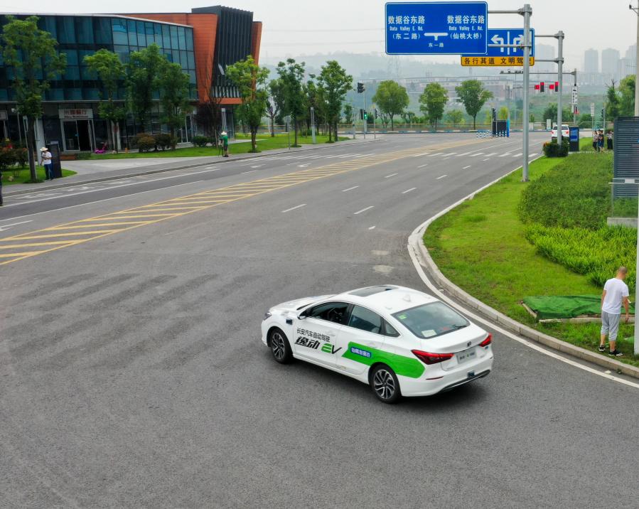 这是国内首个在渝投用的5G自动驾驶开放道路场景示范运营基地,一辆L4级自动驾驶汽车在进行自动驾驶模式下的测试运行。新华社记者刘潺 摄