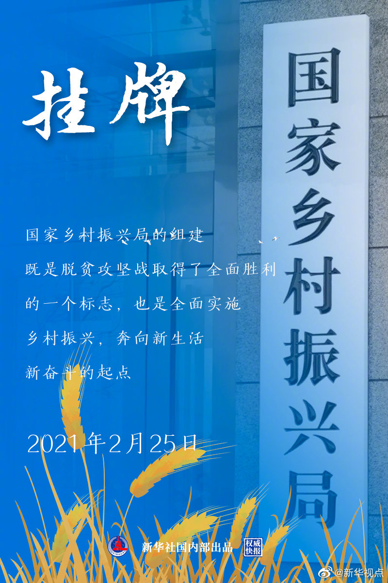 新华社北京2月25日电(记者侯雪静)25日16时,北京市朝阳区太阳宫北街1号,“国家乡村振兴局”牌子挂出,“国务院扶贫开发领导小组办公室”的牌子此前已经永久摘下。这意味着这个自1986年设立的机构结束历史使命,国家乡村振兴局正式成立,开启全面推进乡村振兴的崭新时代。