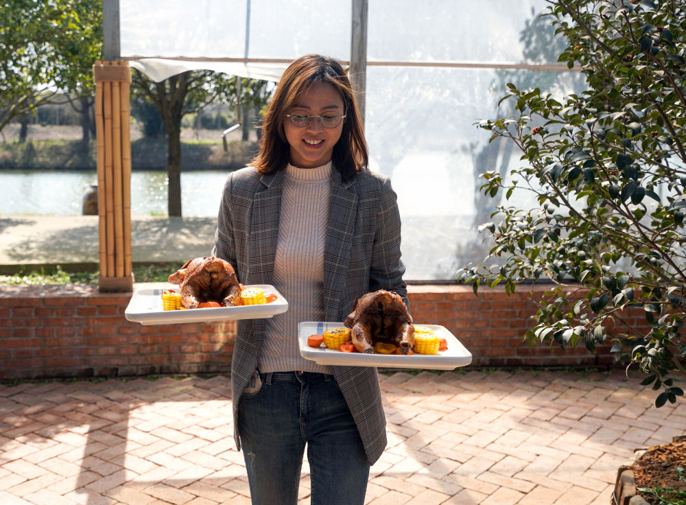 谢丞恩在农场内给参观的客人端上烤鸡。新华社记者 季春鹏 摄