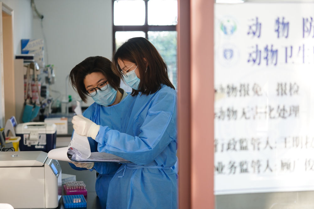 谢丞恩(右)在农场实验室查看实验数据。新华社记者 季春鹏 摄
