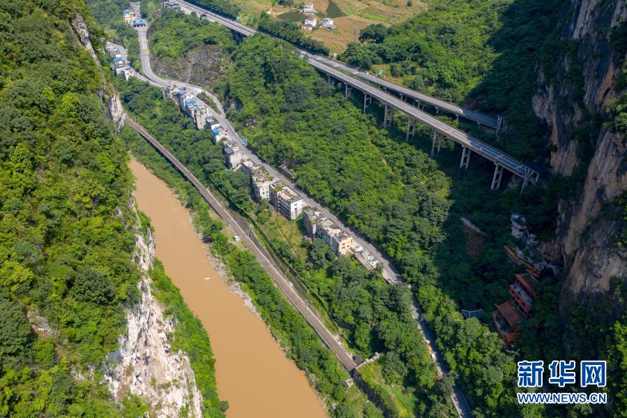 在云南省昭通市盐津县豆沙关,关河水道、内昆铁路、G247公路等不同时期的交通线路以几乎并行的姿态呈现眼前(2020年8月10日摄,无人机照片)。新华社记者 江文耀 摄