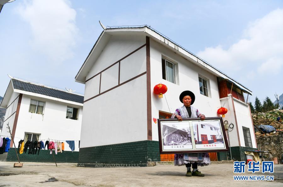 在贵州省黔西县新仁苗族乡化屋村麻窝寨易地扶贫搬迁集中安置点,搬迁户站在新房前展示自家搬迁前后的对比照片(2月20日摄)。新华社记者 杨文斌 摄