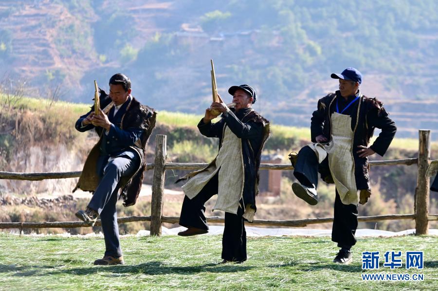2月26日,彝族老人在打跳。新华社发(邓斌 摄)