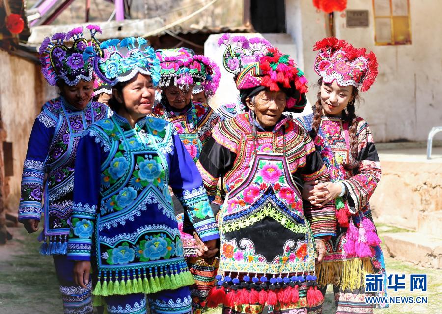 2月26日,李永福嫫老人(右二)准备前往“赛装”现场。新华社发(杨雷 摄)