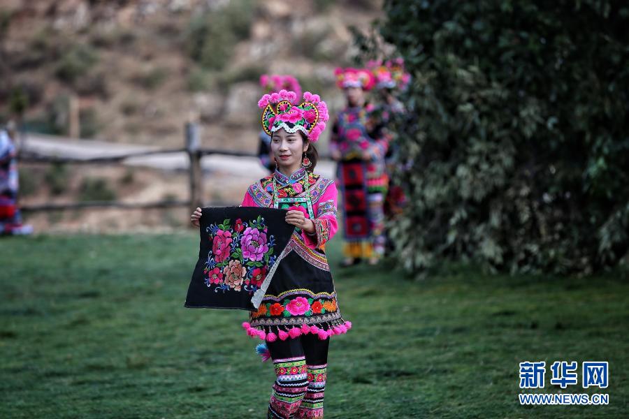 2月26日,一名彝族姑娘在展示她的彝绣作品。新华社发(杨雷 摄)