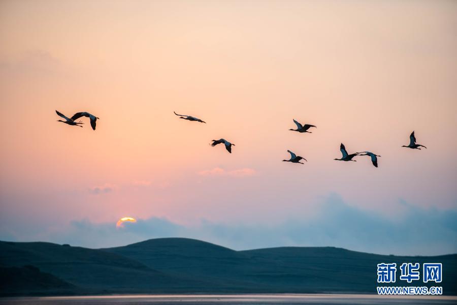 日出时分,黑颈鹤在大山包黑颈鹤国家级自然保护区飞翔(2月25日摄)。新华社记者 胡超 摄
