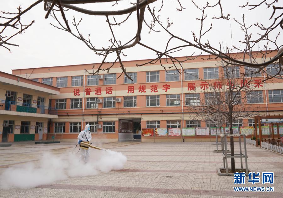 2月27日,在河北省邢台市内丘县实验小学,工作人员对校园进行消杀作业。新华社发(刘继东 摄)