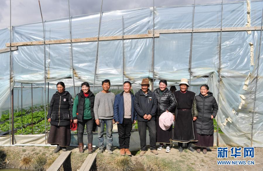 陈千(左四)和甲日卡村村民及温室大棚种植户在大棚前合影(2月25日摄)。 新华社记者 晋美多吉 摄