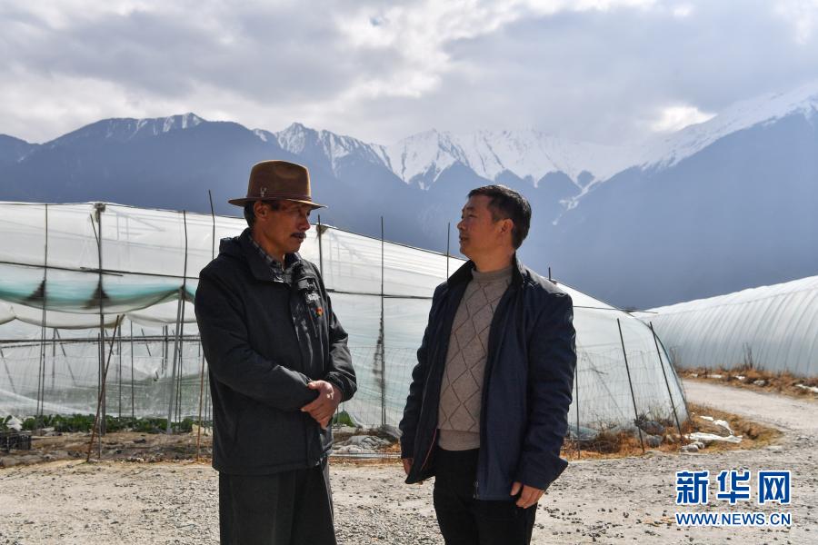 陈千(右)和甲日卡村党支部书记多多在温室前商讨怎样促进村民增收(2月25日摄)。 新华社记者 晋美多吉 摄