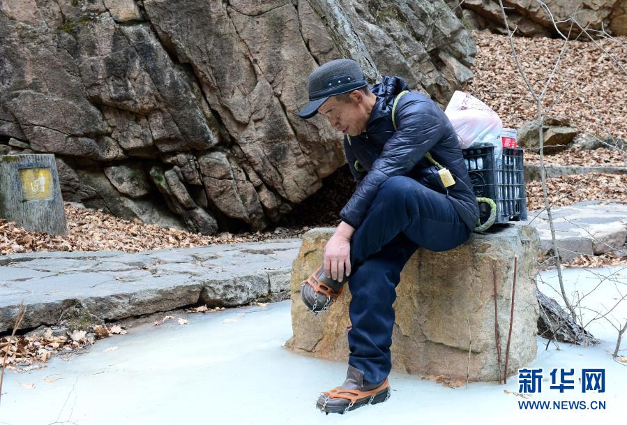 2月27日,在驼梁国家级自然保护区,巡护员戎喜民在冰封路段行走前穿防滑冰爪。 新华社记者 金皓原 摄